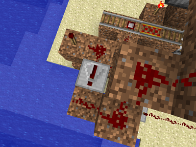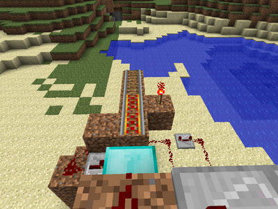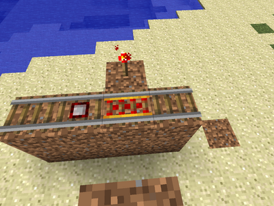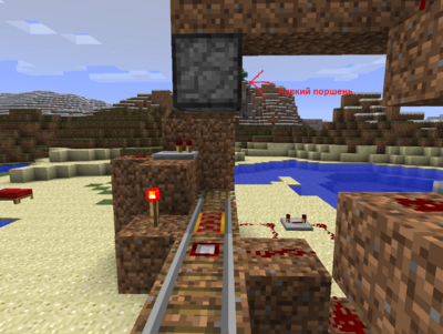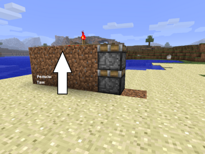 Установите поршень, который толкает вагонетку, и поставьте перед ним любой блок (в данном примере алмазный). Также сделайте ж/д полотно (и насыпь) на 2 клетки выше, чем обычный поршень.