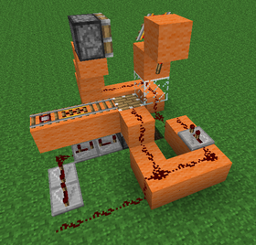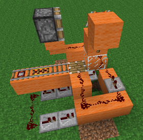 Это несколько другая конструкция нежели представленная выше. Она по размерам намного меньше и занимает меньше ресурсов. Единственное различие в работе между конструкцией представленной выше и этой в том, что самый верхний поршень толкает вагонетку не через какой-либо блок (в данном примере алмазный), а напрямую.