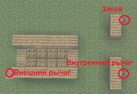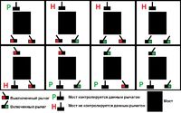 Мост имеет три рычага, а значит, и три пункта управления. Это — внешний рычаг, внутренний рычаг и засов. Различные способы их комбинирования могут открывать и закрывать мост. Справа представлен рисунок всех возможных вариантов состояния системы управления мостом. Можно увидеть, что засов не является открывающим/закрывающим рычагом.