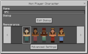 Если щелкнуть правой кнопкой мыши по NPC, появится интерфейс, и его можно редактировать, только если у игрока есть разрешение на застройку мира. Интерфейс позволяет игроку редактировать диалог, имя, внешний вид и расширенные настройки. Когда у игрока нет разрешения мирового строителя, он показывает только диалог и кнопки.