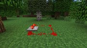 Описание: работающий повторитель способен активировать красную пыль сквозь блок в который упирается. Причем с механизмами и с красным факелом такой трюк не проходит. Скриншот ниже.