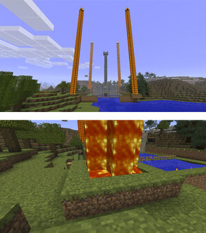Сам столб, как правило, только в один блок толщиной, а наверху факел (или иногда даже лава) для облегчения обнаружения ночью. Будьте осторожны, не делайте столбы слишком высокими, иначе при спуске вы можете умереть даже на мирном уровне сложности. Если поставить на вершине такого столба блок воды, можно спуститься по нему. В основании столба можно поставить факел, указывающий направление до следующего ориентира. Преимуществом этого метода является то, что столбы видно гораздо дальше, чем наземные маркеры, что позволяет использовать меньше знаков. Беспроигрышным вариантом является создание столба максимальной высоты и установка блока лавы на его вершине. Для создания такой башни потребуется приблизительно 60-70 блоков любого материала и ведро с лавой. Перед постройкой лучше выложить все ценные вещи в сундук, чтобы не потерять их в случае смерти. Строим столб до максимальной высоты, далее делаем горизонтальный мостик (клавиша ⇧ Shift) и выливаем на него сбоку лаву. Ещё необходимо сделать ограждения у подножия башни, чтобы лава не растеклась вокруг, разрушая все на своем пути! В 1.4.2 появилась альтернатива столбу — маяк.