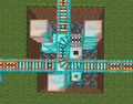Если расположить рельсы как на картинке справа, вагонетка, несмотря на кажущуюся невозможность нормальной поездки, будет нормально двигаться по прямой, без тряски. Хоть она и будет колебаться между двумя противоположными положениями, но игрок заметит это только по изменению текстуры, на механику это не влияет, даже вагонетка с печью продолжит нормально ехать. Это увеличивает возможности железнодорожных коммуникаций по охвату территории, также позволяет делать более округлые повороты, на которых трясет заметно меньше.