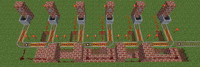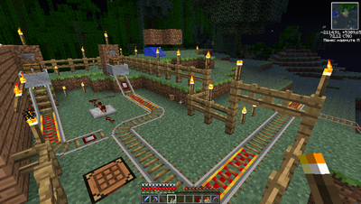 Постройка Сначала закладываем автоматический запускатель: в версиях до 1.5 вагонетка не стартует, даже если под ней включить рельсы. Её требуется «пнуть», что невозможно при нахождении внутри вагонетки. Лечится установкой рельсов вплотную к какому-нибудь блоку. Ставьте блок земли, на него — электрорельсы, затем спускайте обычные рельсы и ставьте 3 блока электрорельсов, после чего с конца пути ставьте ещё блоки и кнопку. Совет: красный факел можно спрятать под рельсы, подкопавшись под них и поставив красный факел через блок вниз от рельсов. Далее объединяйте оба пути, у вас должна получиться «вилка». Далее, на том пути, на который указывает развилка, спускающиеся рельсы и противоположные от стрелки замените на нажимные. От них ведёт дорожка красной пыли прямо к стрелке. Не забудьте установить повторитель на максимальную задержку: иначе вагонетка не успеет заехать на соседние пути (стрелка переключится прямо перед ней). Если вы сделали все как на скриншоте (забор и освещение необязательны: просто автору очень мешали мобы), любая заехавшая на занятую парковку вагонетка будет тыкаться по карманам до первого свободного слота (к сожалению, стоящую на нажимных рельсах вагонетку нужно пнуть, что нивелирует всю автоматизацию. Впрочем, выезжать вагонетки будут «напрямую», не заезжая в каждый карман). Теоретическая вместимость такой станции не ограничена: достаточно переделать дополнительные слоты наподобие правого на скриншоте.