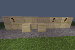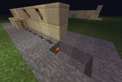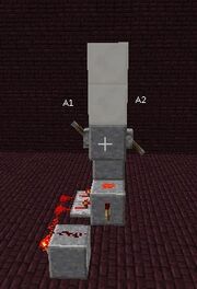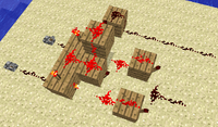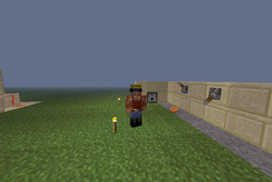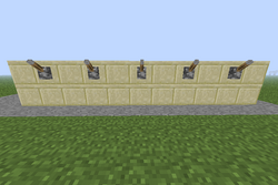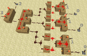 3. Обходим нашу схему с тыльной стороны и на тех блоках, где у нас установлены рычаги в нижнем положении, вешаем красные факелы. Они сразу должны потухнуть. Это будет значить, что вы поставили их верно
