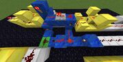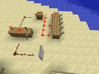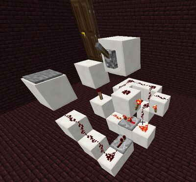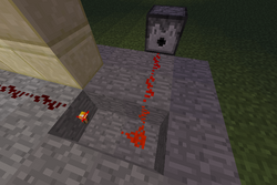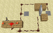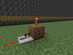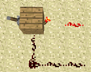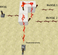 Простой переключательСобственно ничего сложного. Рычаг либо включает факел и выключает нижний провод, либо наоборот. A если добавить AND вентиль, то возможна блокировка. | Простой переключатель |