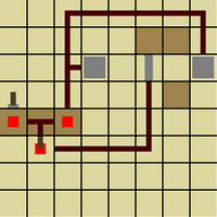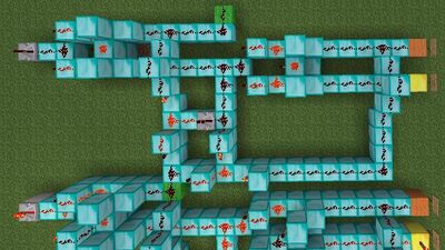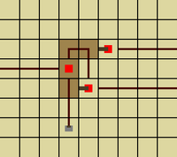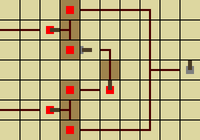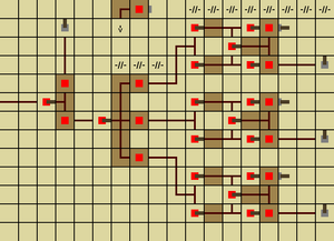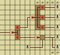 В такой схеме сигнал на выходе появляется практически сразу при подаче на вход, а исчезает спустя некоторое время после снятия входного. Каждые два повторителя представляют собой звено, которое может поддерживать сигнал до 0,4 с. Повторители, идущие в одну линию, настраиваются для достижения нужной длительности поддерживания сигнала, поперечные — в режиме минимальной задержки. Необходимо также помнить о правиле 15 клеток для выходной линии (той, что идет после поперечных повторителей).