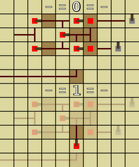 Переключатель сигналаВ схеме используются два элемента: AND Gate и простой переключатель. Напомню, что AND Gate на выходе имеет 1 , если на входе получено две 1 . Сигнал in подается на один вход на каждый AND Gate, а сигналы на выходе из простого переключателя идут на два оставшихся входа AND Gate. Схемы, реализующие подобную систему представлены во врезке в двух вариантах: «Толстый» и «Длинный», и отличаются только в размерах. | | |