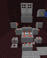 Давайте попробуем это построить! На блоках с «правильными» рычагами ставим красные факелы, неправильные же просто замыкаем напрямую к цепи. Дальше ставим инвертор и дальнейший сигнал подводим к AND Gate, на втором входе которого стоит «засов». Вот и все, ставим дверь и готово.