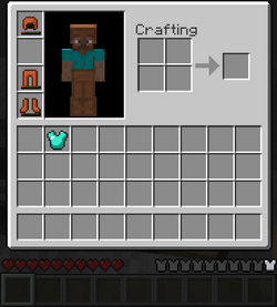 Надета повреждённая кожаная броня вместе с алмазной кирасой.