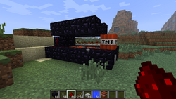 Преимуществом «классической» конструкции является её простота, но в то же время она обладает низкой эффективностью — взрывная энергия заряда используется не полностью. Проблему может решить или концентратор заряда, или менее простая конструкция, в которой заряд изначально ближе с снаряду. Конструкция самой слабой пушки довольно простая. Для постройки понадобится четыре блока обсидиана. Для начала расставьте три блока обсидиана на поверхности. Затем последний блок обсидиана поставьте на 1/3 блоков обсидиана, поставленных на этапе первом. Блок должен быть установлен на противоположной стороне от направления стрельбы. Зарядите пушку. У вас должен получиться прямоугольник 6х3 блока. Четыре блока обсидиана и два блока динамита. Подожгите блок стоящий у верхнего блока обсидиана, затем через три секунды подожгите второй блок динамита. Когда взорвется первый блок динамита вылетит второй.