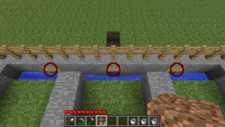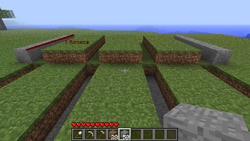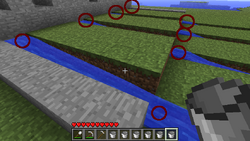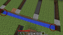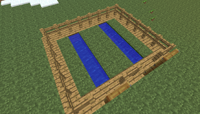 Создайте канавки для воды произвольной длины в произвольном количестве. Лучше всего размещать их параллельно, а расстояние между ними оставлять 2 блока. Также для экономии места можно делать углубления в 1 блок, заполненные водой, расположенные на расстоянии 8 блоков.