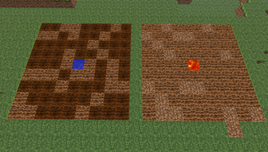 Сравнение грядки, которая увлажнена водой (слева) и грядки, которую невозможно увлажнить лавой (справа). Лава не пропитывает землю ни в «хорошем», ни в «плохом» смысле (правая грядка увлажняется дождём, как если бы лавы не было).