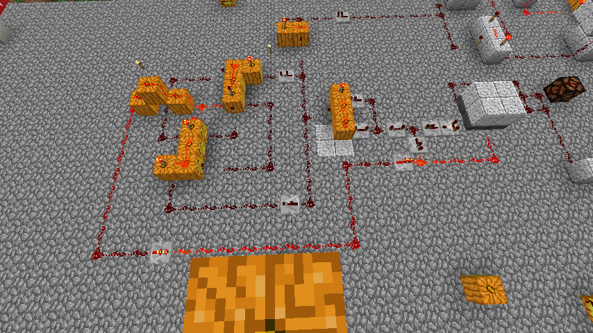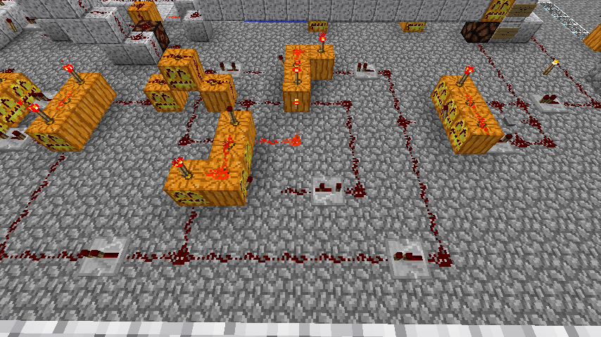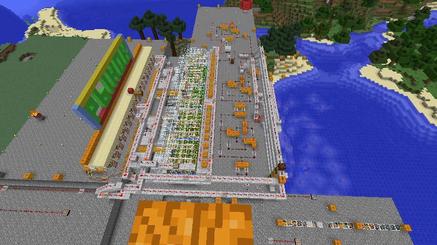 Общий вид на автоматическую ферму пшеницы и моркови. Слева сами фермы, справа внизу триггеры-счётчик, справа вверху — однотактный таймер