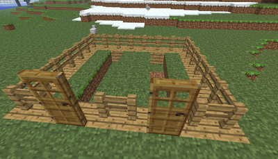 Прежде всего нужно позаботиться о безопасности посевов на ферме. Как известно, большинство мобов могут топтать грядки, поэтому следует предпринять несколько мер, чтобы исключить возможность спауна или попадания мобов на вашу ферму. Затем следует создать ограждение вокруг фермы, только оставить несколько проемов для дверей.