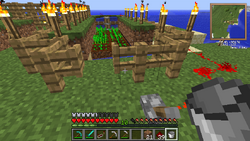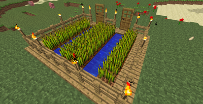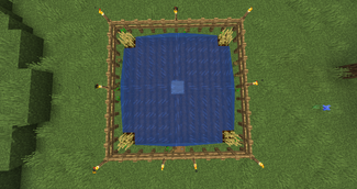 Опционально: Факелы, светильники Джека или светящийся камень будут способствовать более быстрому росту урожая и предотвратят спаун враждебных мобов на территории фермы; Можно использовать 2 ведра воды и создать бесконечный источник воды рядом с постройкой.