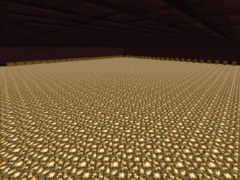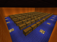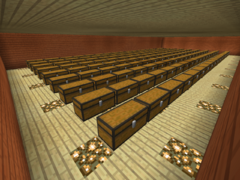 | Оформление | Если вы собираетесь строить склад, то этот пункт можете пропустить. А для тех кто раскапывает склад, то сразу после полной раскопки лучше сразу заняться её оформлением, поскольку с сундуками будет сложно этим заняться. Потолок нужно обязательно усеять одним из видов полублоков, поскольку сундук не сможет открыться в потолок, который имеет полноценный блок. Также вы должны усеять пол каким-то видом блоков, а также желательно в полу установить светокамень для освещения, чем факела. Стены приукрасить можно даже при огромном наличии сундуков. | |