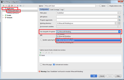 После выполнения выше перечисленных действий, в верхней части экрана перейдите в раздел "Run" и выберите пункт "Run configurations". По очереди выберите "Minecraft Client" и "Minecraft Server" и уже в правой части окна, в раскрывающемся списке "Use classpath of module" выберите тот пункт, который заканчивается на _main. Теперь вы можете запустить клиент или сервер и удостовериться, что все работает.