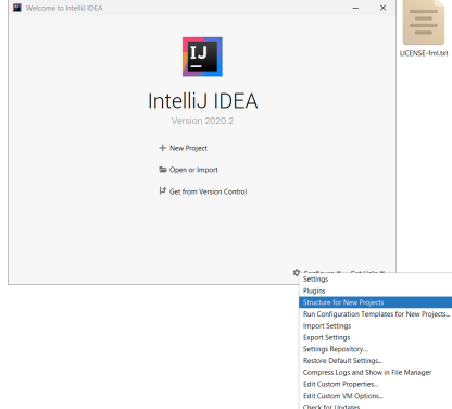 Если вместо Eclipse Вы решили использовать IntelliJ IDEA, то после того как вы установите ее, в стартовом окне в правом нижнем углу нажмите на кнопку "Configure", откройте вкладку "Project Defaults" и выберите пункт "Project Structure" или в главном меню нажмите комбинацию клавиш (Ctrl+Alt+Shift+S).