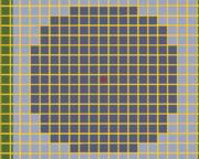 На рисунке виден радиус обновления блоков при нахождении игрока на месте красной метки. Желтым отмечены границы чанков.
