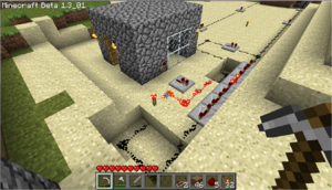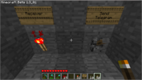 Несмотря на это, это единственный вид телеграфа, который имеет реальное применение в одиночной игре. Если некто имеет передатчик в шахте, и приемник в доме, он может использовать его как наклейку для напоминаний, например, что в этой шахте были алмазы. Развивая эту идею, можно предположить, что он может иметь несколько факелов дома, показывающих, в какой из шахт он нашел алмаз, или другой ценный материал. Пример такого использования показан слева. В многопользовательской игре такой тип телеграфа может быть использован для оповещения о тревоге/событии, или о чем угодно, обговоренном заранее.