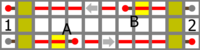Являясь основным типом, классический телеграф прост в постройке, но сложен в использовании. Он состоит из одного рычага, одного инвертора, и одного красного факела для каждого направления связи. Справа показана схема простого двухстороннего телеграфа. 1 и 2 — комнаты управления, А и В — инверторы. Заметьте, что расстояние между двумя инверторами может быть увеличено установкой нужного количества повторителей. Классическая конструкция позволяет быструю постройку и пространство всего лишь 1×2×3 для каждой комнаты. В добавок, для ее постройки не требуется знание логических схем или постройки сложных электрических цепей, что делает ее идеальной для новичков в использовании красного камня.