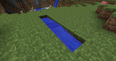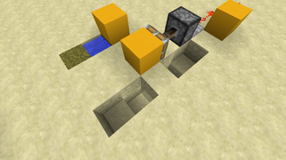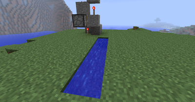 Затем следует выкопать канаву с водой произвольной длины, однако она должна быть расположена на расстоянии 2 блока от проекции липкого поршня в сенсорном механизме на горизонтальную поверхность. После этого следует закрыть канаву сверху любыми блоками, на которые возможно устанавливать поршни, а со стороны, где расположен сенсорный поршень, посадить ряд тростника. Главное, чтобы один из блоков с тростником был расположен возле сенсорного поршня, и чтобы при росте тростник «касался» его.