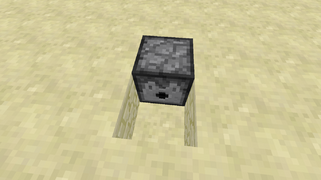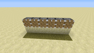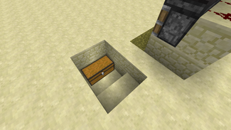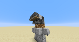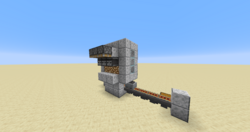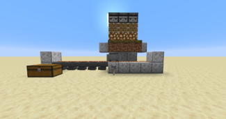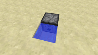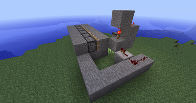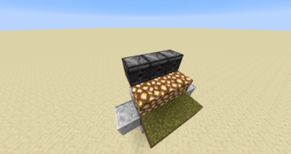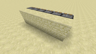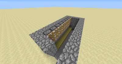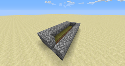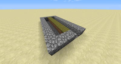 Затем закройте сверху воду двумя вертикальными рядами блоков булыжника и поднимите другие стенки на один блок. Далее расположите над только что установленным рядом булыжника над водой два вертикальных ряда поршней любого типа, но так, чтобы при активации сами поршни высовывались в сторону места для посадки тростника, то есть бордюра из грязи. (Меньше затрат составляет конструкция, состоящая из одного ряда поршней, так как при удалении нижнего блока тростника выпадают и верхние, также существует ошибка с возвращением верхнего ряда поршней)