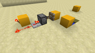 После нажатия на кнопку красная пыль активирует раздатчик с ведром, раздатчик забирает воду в ведро, после чего красная пыль активирует сахарный тростник, что приводит к его обновлению. Так как воды около тростника нет, он срубается, после чего снова активируется раздатчик, который снова выливает воду.
