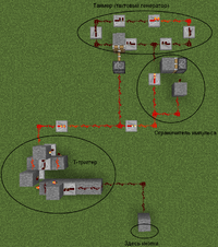 От кнопки сигнал идёт к Т-триггеру. (После постройки Т-триггера приведите его выход в состояние «выключено».) На выходе сигнал разветвляется. Левая ветвь ведёт к липкому поршню, который выдвигает твёрдый блок в место перед одним из повторителей таймера, позволяя сигналу проходить. Правая ветвь тоже делится на две части: первая ведёт к участку таймера, а правая — через инвертор к липкому поршню, который выдвигает твёрдый блок перед повторителем в первой части. Вся правая ветвь является ограничителем импульса.