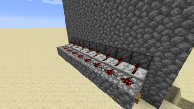 Сделайте пристройку к щели шириной 2 блока. На первом ряду пристройки (слева на право) разложите красную пыль, на втором — повторители, двумя красными факелами к щели. В щель заложите поршни, передом внутрь комнаты. Также поставьте кнопку так, чтобы она активировала красную пыль.