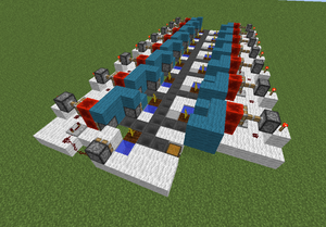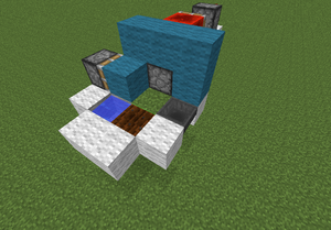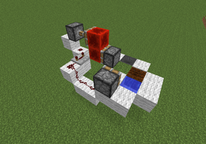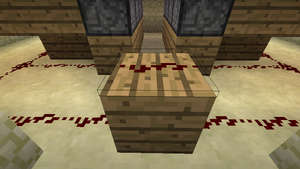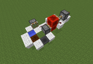Выбрана конструкция ДОБ-а на основе блоков красного камня и квазисоединимости поршней, как наиболее компактная и простая. Принцип действия: при изменении блока, примыкающего к датчику (в данном случае — левый поршень), поршень срабатывает.