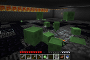 Глубинные слизни также отыскиваются по характерному звуку. Пробивая горизонтальные штреки над коренной породой в поисках алмазов, часто можно услышать слизня в пещере над собой. Пробейте выход в эту пещеру и отмечайте точку поимки слизня аналогично каньону. Помните, что основной источник света на глубине — лава, так что слизень, скорее всего, припрыгал в точку встречи с ним от ближайшего лавопада — будьте осторожны.