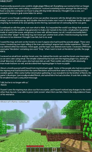 Это показало, что Нотч настроен против добавления его в игру. Однако факт «как такового» вызывает у фанатов надежды, что что-нибудь вроде Хиробрина будет добавлено в игру, возможно, в более поздних обновлениях. Итак, ещё раз, тот же пользователь попросил объяснить это: