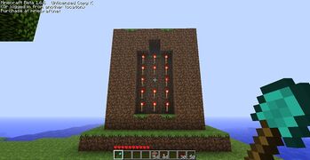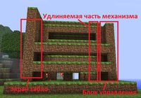 В механизме табло есть три части, с которыми Вам предстоит работать: экран табло, блок управления и удлиняемая часть. Экран табло выводит информацию, которая передается с помощью блока управления, путем переключения рычагов (рычаг включает и выключает красный факел). Комбинируя рычаги, можно выводить на табло цифры, буквы и различные знаки. В этой конструкции красные факелы являются аналогами красных светодиодов. Наличие удлиняемой части позволяет увеличить расстояние между экраном и блоком управления. Это можно сделать, "скопировав" блоки этой части и продлить цепь из красной пыли, используя повторители.