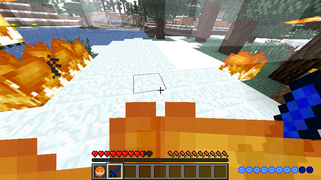 | Заснежье | | Мир представляет собой огромные равнины с частыми и высокими деревьями. Чтобы попасть в него, необходимо построить рамку портала из блоков снега и активировать снежным шаром. Иногда происходят перепады высот, выглядящие как утёсы. Также, тут можно встретить небольшие мастерские. Под землёй встречаются пещеры, как и в обычном мире, но они лишены всяких руд. Часто там генерируются сокровищницы. Внутри них есть замороженные сундуки, в которых хранятся снежинки, использующиеся как валюта при торговле с местными торговцами. |