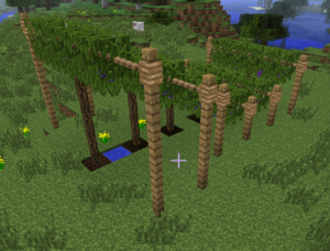 «Добравшись» до верёвки, лоза наращивает листовые кубы на все 4 стороны, но при условии наличия верёвки. От одного ствола в сторону «нарастает» 2 куба листвы. то есть по прямой всего 5 кубов лозы со стволом по середине.