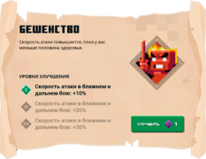 Бешенство (англ. Frenzied) — это чары в Minecraft Dungeons, которые увеличивают скорость атаки игрока, когда его здоровье падает ниже половины. Скорость атаки увеличивается с каждым уровнем улучшения.