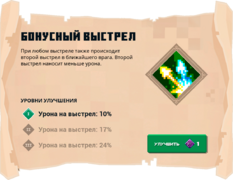 Бонусный выстрел (англ. Bonus Shot) — это чары в Minecraft Dungeons, которые при стрельбе из лука также выпускают вторую стрелу в направлении ближайшего врага. Однако вторая стрела всегда будет наносить меньше урона, чем основная. Количество урона, наносимого второй стрелой, увеличивается с каждым уровнем улучшения.