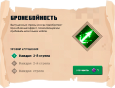 Бронебойность (англ. Piercing) — это чары в Minecraft Dungeons, которые позволяют стрелам пробивать мобов при выстреле из лука или арбалета. Количество выстрелов, необходимое для активации эффекта бронебойности, увеличивается с каждым уровнем улучшения, что в конечном итоге ограничивается эффектом бронебойности, применимой к каждой выпущенной стреле.