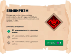 Вампиризм (англ. Leeching) — это чары в Minecraft Dungeons, которые будут исцелять игрока в случае победы над мобом. Количество исцеления — это небольшая часть максимального здоровья целевого моба. Количество здоровья, полученного от моба, увеличивается с каждым уровнем улучшения.