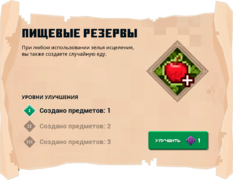 Пищевые резервы (англ. Food Reserves) — это чары в Minecraft Dungeons, которые заставляют выпадать еду при использовании лечебного зелья, даже если игрок полностью здоров. Количество созданной еды увеличивается с каждым уровнем улучшения.