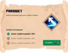 Рикошет (англ. Ricochet) — это чары в Minecraft Dungeons, которые дают стрелам шанс отскочить от мобов. Вероятность этого увеличивается на 20 % с каждым уровенем улучшения.