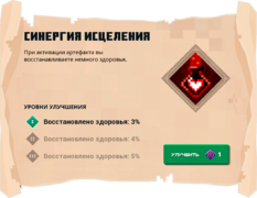 Синергия исцеления (англ. Health Synergy) — это чары в Minecraft Dungeons, которые немного исцеляют игрока каждый раз, когда активируется артефакт. Количество восстановленного здоровья увеличивается с каждым уровнем улучшения.