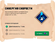 Синергия скорости (англ. Speed Synergy) — это чары в Minecraft Dungeons, которые увеличивают скорость игрока при использовании любого артефакта в течение ограниченного времени. Длительность скорости увеличивается на одну секунду с каждым уровнем улучшения.