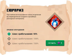 Сюрприз (англ. Surprise Gift) — это чары в Minecraft Dungeons, которые заставляют выпадать расходные материалы (зелье силы,зелье ускорения,теневое зелье, пучок стрел) при использовании лечебного зелья, даже если игрок полностью здоров. Шанс срабатывания увеличивается на 50 % с каждым уровнем. Эти чары сбрасывают только зелья и пучки стрел.