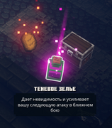 После употребления теневого зелья, игрок становиться невидимым и увеличивает свой урон на следующую атаку, которые объединяюься в «Теневую форму». Эффект длится тридцать секунд и по окончании перестаёт действовать либо после того как игрок ударит врага.